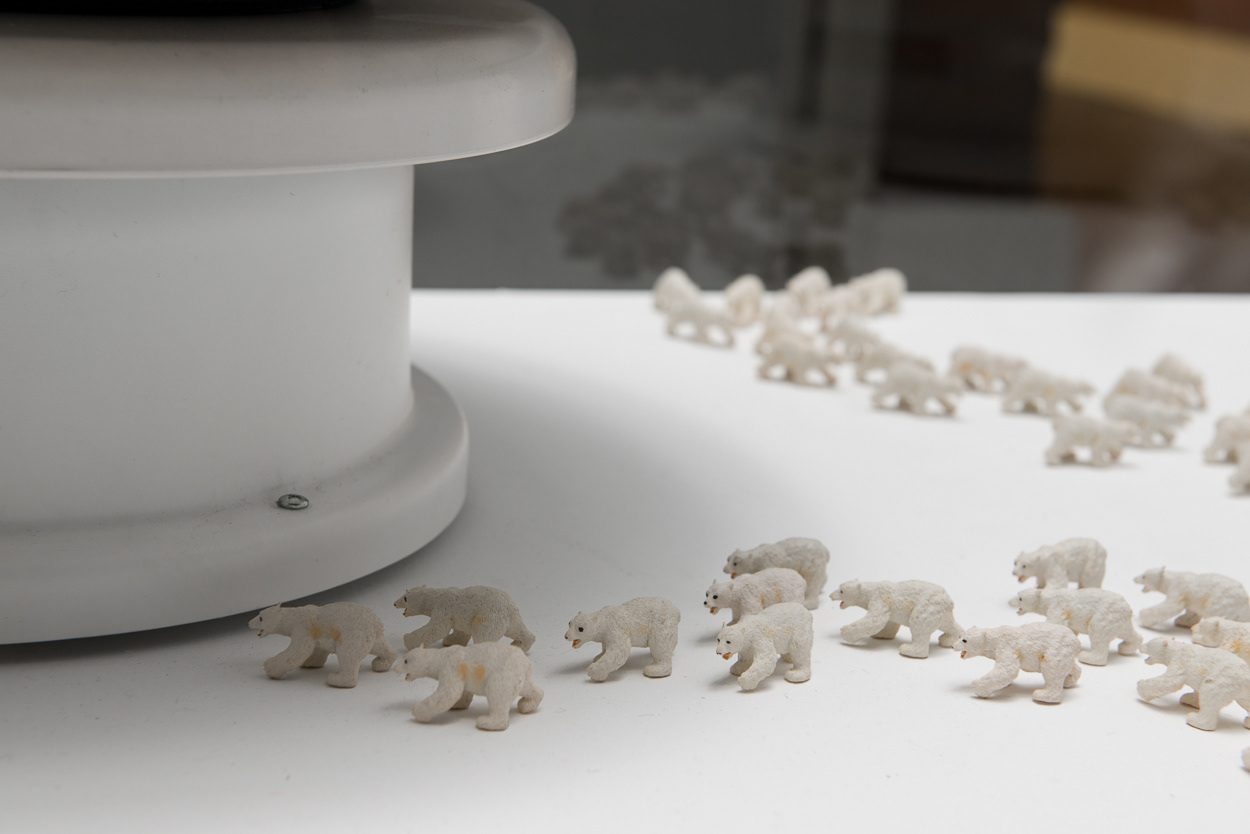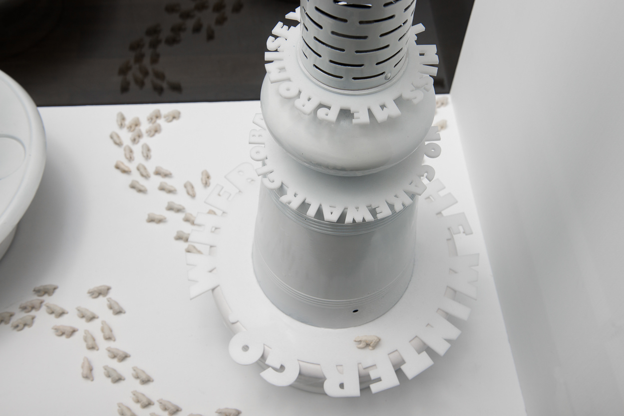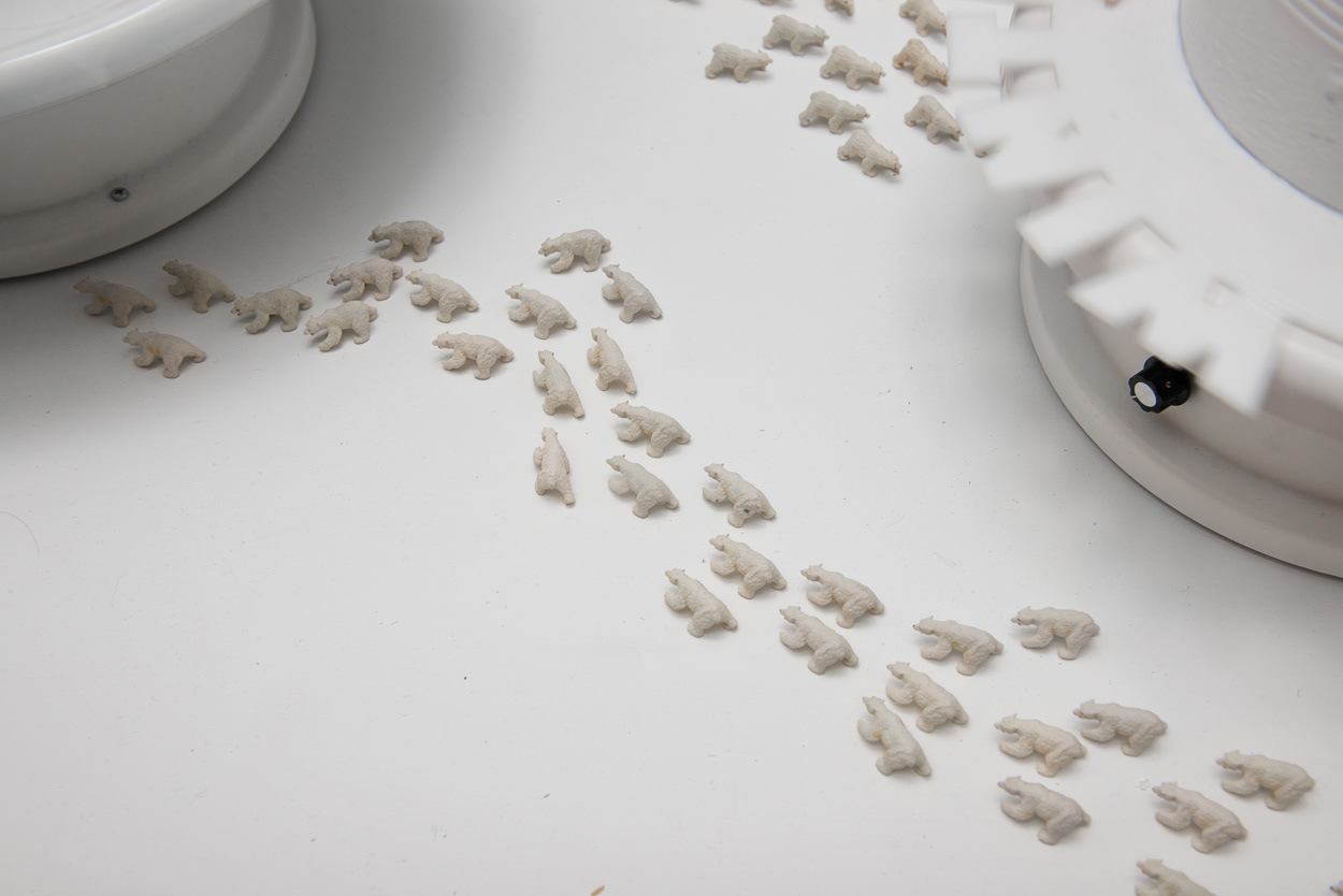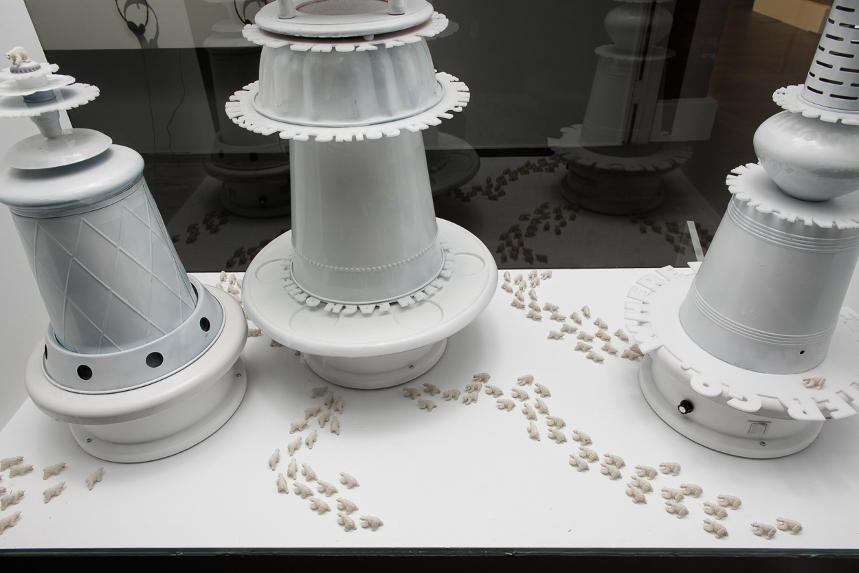 The installation places a miniature population of polar bears into a kinetic display, which references a pastry shop window. Slowly revolving cake forms created from recycled household objects provide allusions to precarious icebergs of the far north. Laser-cut acrylic rings that articulate messages such as “Where did the winter go?” and “What if you never see us again?” provide formally interesting shadow plays atop the white forms of the kinetic sculptures.