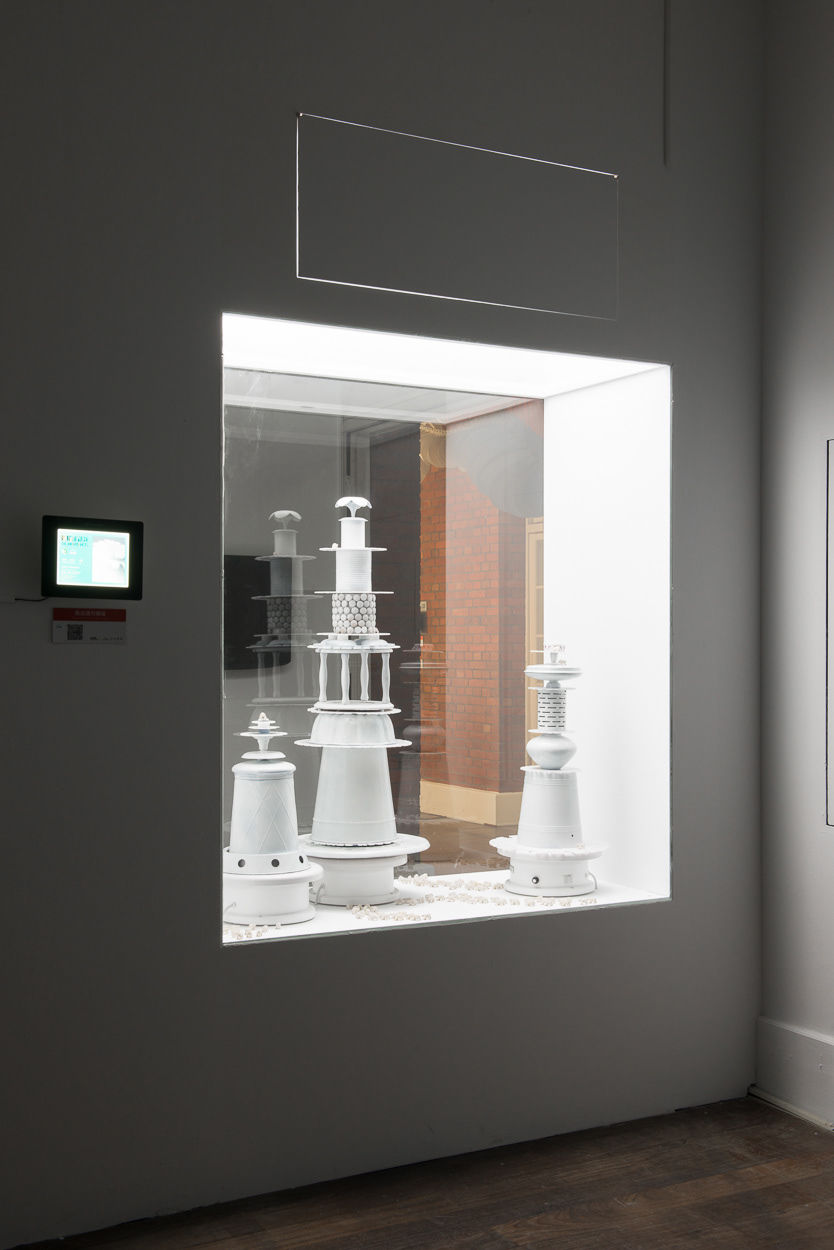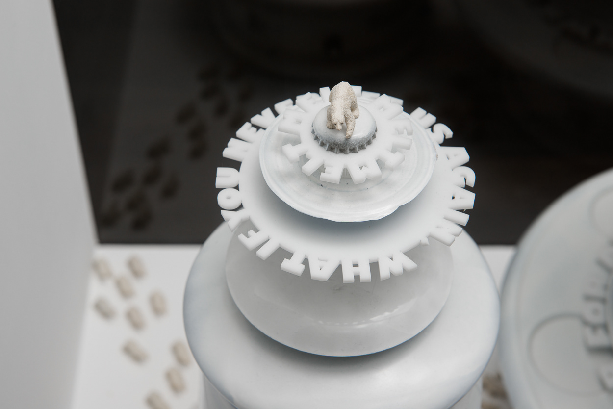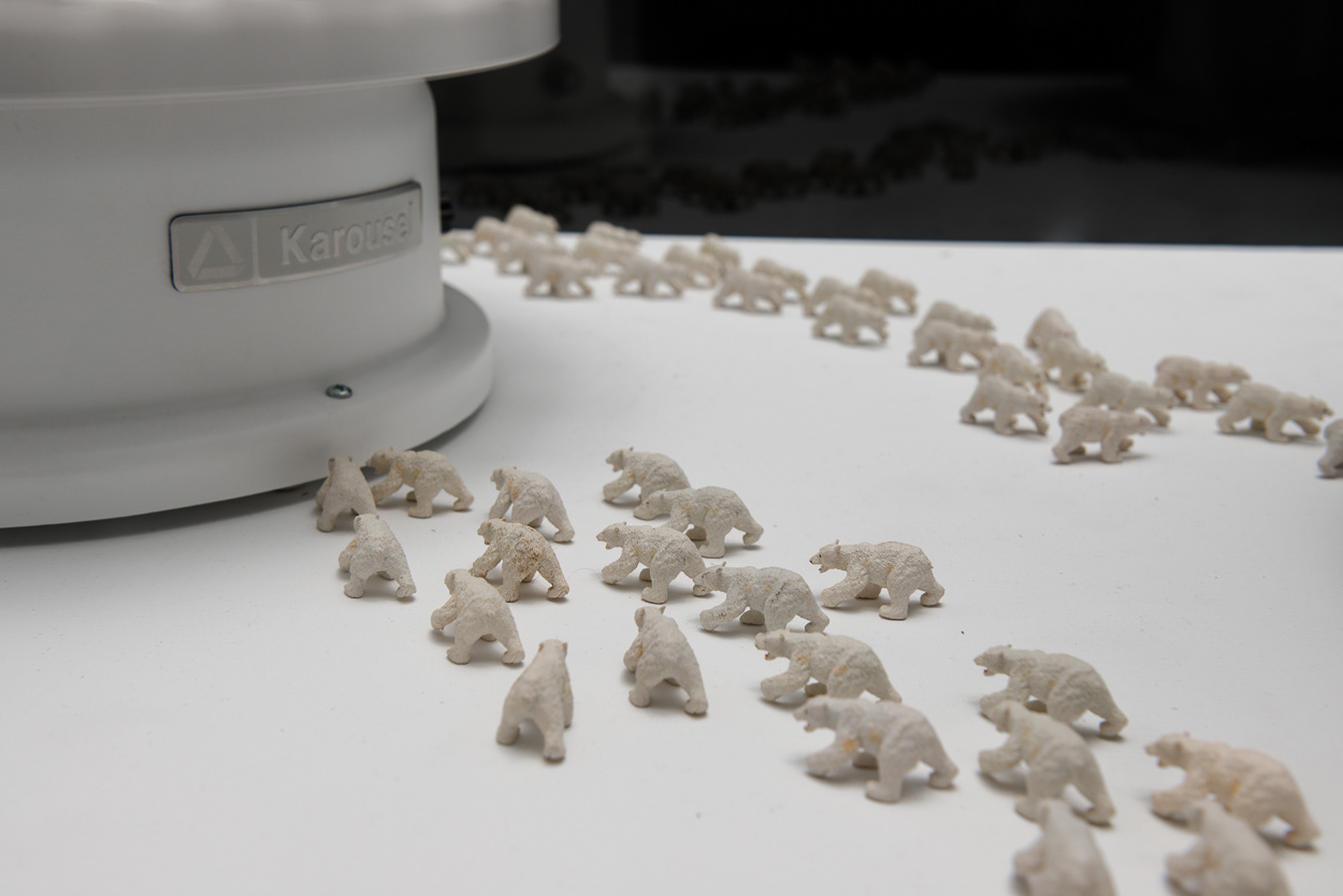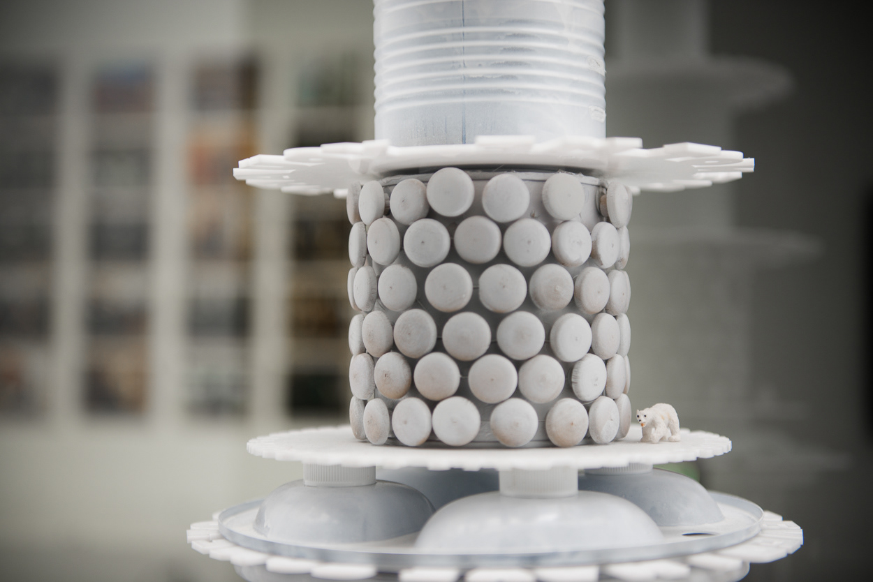 The installation places a miniature population of polar bears into a kinetic display, which references a pastry shop window. Slowly revolving cake forms created from recycled household objects provide allusions to precarious icebergs of the far north. Laser-cut acrylic rings that articulate messages such as “Where did the winter go?” and “What if you never see us again?” provide formally interesting shadow plays atop the white forms of the kinetic sculptures.